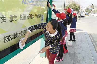 在该校老师的带领下,学生穿着整齐的校服,到学校附近的十字路口为执勤的交警送去问候,帮助老奶奶要过马路,遇到不遵守交通规则的行人主动上前劝导。
