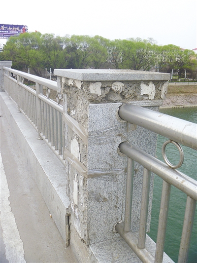 3月9日上午10时,记者来到网友所说的市区嵩山路沙河桥。在桥上,记者仔细观察发现,固定不锈钢桥栏杆的水泥石墩的确有不同程度的缺失和脱落。