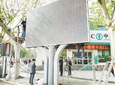 4月7日上午,记者在市区泰山路与黄河路交叉口西南角看到,路边的机动车道和非机动车道之间的人行道上,几位工作人员正在安装调试大屏幕。