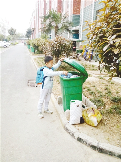 在学校,他爱护花草树木,做到不摘花,不踏进草坪,当看见有人随手扔垃圾时,就会立刻捡起扔进垃圾箱,还告诉小朋友不能随手扔垃圾。