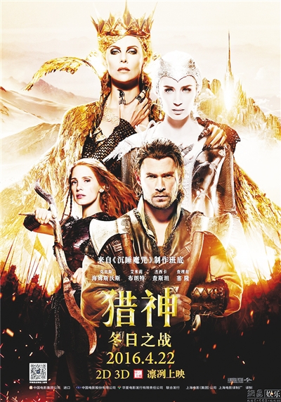 《猎神:冬日之战》是《白雪公主与猎人》的续集,故事发生在两位女王统治下的冰雪王国。“锤哥”饰演的“猎神”与女勇士萨拉相爱,这违反了冰雪女王的禁令,随着对抗的升级,双方阵营都出现了微妙的变化。本片的动作场面密集,海姆斯沃斯的武器不再是锤子,而是斧头。为了本片的大量打戏,塞隆特地集中训练了七周体能,她饰演的邪恶女王的魔法强大,能使千万件武器一起发射。