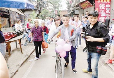 近日,在武汉汉口街头,一位新郎骑着一辆老式28自行车,后面跟随由21辆公共自行车组成的迎新车队,迎娶新娘,引来路人围观。新娘段雯说,他们对婚礼有多个设想,但为了追求浪漫,两人决定用自行车来迎新,“比坐奔驰宝马拉风多了”。(新华网)