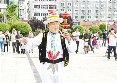 空竹爱好者宋德成,是众多表演者中特别的一个:穿着镶金边的黑色马褂,头戴一顶花帽,腰间插着三把刀。要表演魔术吗?他拿出三个空竹,依次抖动:三个空竹在他的帽子上、烟袋锅上同时转动(如图)。