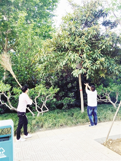 记者看到三个年轻小伙摘枇杷,一个拿着扫帚高高跃起,将枇杷枝拉低采摘,另外两个,一个爬上树,另一个在下面接果子(如图)。不一会儿,地上落了许多枇杷。其中一个年轻人,拿起枇杷就吃了起来。