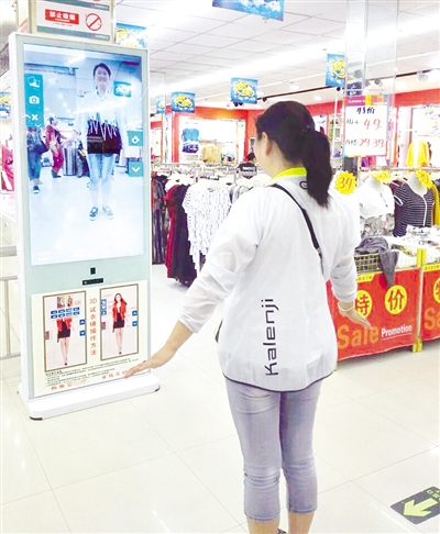 “这还真是稀奇,人站在镜子前就能自动换衣服,而且衣服还一套一套不停地变换着。”一位市民一边在3D试衣镜前试衣换装,一边高兴地对身边的家人说。只见她站在一台一人多高的机器前,机器屏幕上显示店内各种衣服穿在她身上的3D效果。几秒钟的时间内,已经试穿了几套衣服。