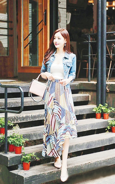 修身牛仔外套内搭一件白色背心,下配一条碎花百褶不对称长裙,将白色打底掖进长裙时小蛮腰也能瞬间显现出来,二八分比例助你长高10公分。