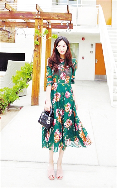 将一条细细的同色系腰带束在绿色印花百褶连身裙上,小蛮腰立即突显出来。如此一来,长裙摆还能起到帮你拉长腿部比例的效果。
