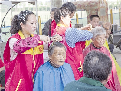 5月19日上午,召陵区天桥街街道3515社区的志愿者,在3515生活区开展志愿服务活动,给社区居民理发、修车等,受到社区居民的欢迎。本报记者 杨 光 摄