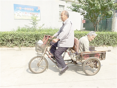 待老伴儿一步一步地挪到三轮车前时,张海江扶老伴儿上车坐稳,然后骑上车卖力地向前蹬。