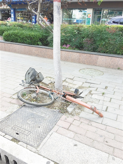 “这辆车我也不知什么时候锁在这里的,即影响美观又对市民出行造成很大不便。”住在附近的市民董先生告诉记者,“每次走这里都看见,也不知道是谁的。希望车主来弄走吧,如果不骑了,卖废品也行。”