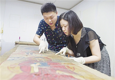 文物修复的标准是“修旧如旧”,这样的“旧”是完整、整洁,没有残缺,整件文物的环境色一致。赵晓龙谈起所从事的古字画装裱专业一丝不苟,他说,遇到有些古字画一直洗不干净,他就会“求教”于妻子张晓珑,让她对古字画材质进行检测。