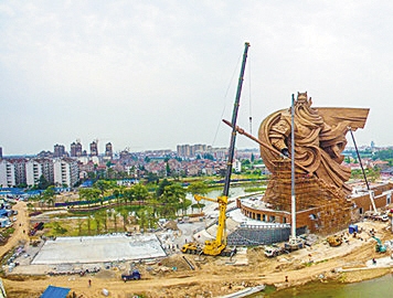 日前,湖北省荆州关公圣像大刀的吊装工程正式启动。这尊全球最大的关公青铜雕像经过一段时间的紧张施工作业,刀身部位的安装已经基本完成。记者从工程指挥部获悉,从5月18日开始,圣像大刀的刀柄部位吊装、焊接工程也已经启动。