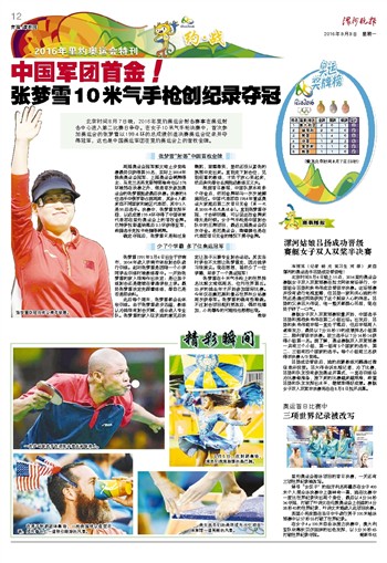 北京时间8月7日晚,2016年里约奥运会射击赛事在奥运射击中心进入第二比赛日争夺。在女子10米气手枪决赛中,首次参加奥运会的张梦雪以199.4环的总成绩创造决赛奥运会纪录并夺得冠军,这也是中国奥运军团在里约奥运会上的首枚金牌。