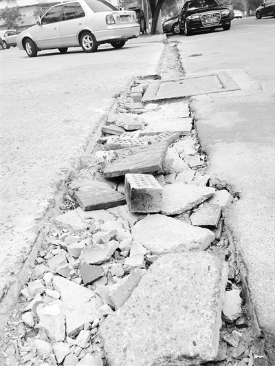 8月17日,记者来到辽河路与交通北路交叉口。在路口西南角,记者发现了市民反映的那条“沟”:二三十米长、约30厘米宽的长方形沟,紧挨交通北路主道,里面杂乱地堆着一些石块、砖头等。记者注意到,这条沟正好处于一栋商务办公楼门前,人员、车辆从大楼进出都要跨过这条“沟”。该商务办公楼的门卫,提起这条“沟”便摇起了头。