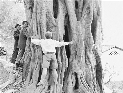 据了解,这棵黄桷树是10年前威远县林业局根据科学论证后,挂上的“树龄500年”牌子。树高20多米,树干要9个人才能牵手相围。奇妙之处就在于这棵古树在很多年前由于白蚁侵袭,曾被放火烧过,并早已衰老。