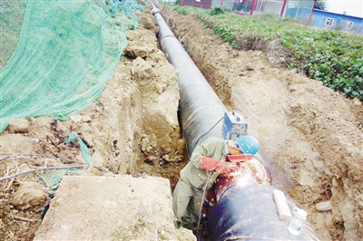 10月17日,我市集中供热三期工程的施工人员在龙江路上焊接热力管道。集中供热是我市城市建设的重点工程,三期工程是淞江产业集聚区热电联产项目的配套管网,自漯河恒瑞热电有限公司(新建热源厂)到淞江产业集聚区,全长约25公里,分为四条主管网,其中龙江路段全长6.5公里,现在已经完成3.3公里。本报记者 王艳彬 摄