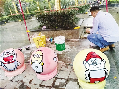 而这些卡通路障的创作者之一韩卫世正在收拾绘画工具,他告诉记者:“小区物业邀请我们来为路障做彩绘。我们两个人,从早上9点开始画,一直到下午4点多,除了中午吃饭,几乎没休息过。”
