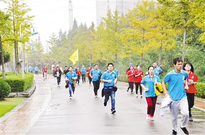 本报讯(记者 王艳彬 实习生 刘 一) 10月21日上午,虽然天空中下着蒙蒙细雨,但是市体育馆的门前广场上热情高涨。中原一起跑·漯河市纪念长征胜利80周年职工万人跑大型公益活动在这里举行。