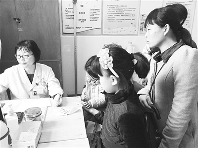 在市第三人民医院儿科门诊室,医生正在为小患者看病。