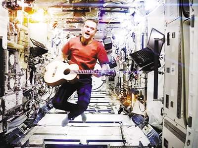 ▲2013年发回的照片,加拿大宇航员克里斯·哈德·菲尔德正在国际空间站上为人们表演首个来自太空的MV。他表演的曲目是翻唱英国著名摇滚音乐家大卫·鲍伊的歌曲《Space Oddity》。