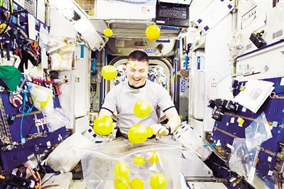 ▲2015年8月25日,美国国家宇航局宇航员Kjell Lindgren正试图封装一袋由日本“白鹳号”H-II运载飞船运抵国际空间站的新鲜水果。然而失重的水果四处漂浮,看上去就像宇航员在玩杂耍。