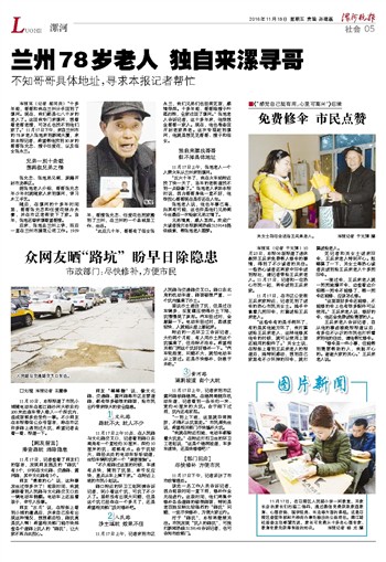 本报讯(记者 郝河庆)“十多年前,哥哥和我在兰州分手回到了漯河。现在,我们都是七八十岁的老人了。这回我专门来漯河,想看看老哥老嫂,可怎么也找不到他们家了。”11月17日下午,来自兰州市的78岁老人张旭来到新闻大厦,求助本报记者,希望帮他找到80岁的哥哥张允忠、嫂子任爱花,以及侄女张永兰。
