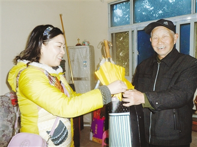11月17日,在市区公安街王兵来家附近,记者见到了送伞的热心市民关女士。她手中拿着几把旧伞,打算送给王兵来老人。
