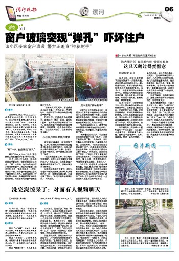 10月16日上午9点多,他正在家里客厅看电视,突然听到阳台上传来 “砰”一声响,他以为是谁扔石头砸他家的窗户,就去阳台查看。刚走到阳台处,突然又传来 一声响,他低头一看,阳台窗户的玻璃上出现个黄豆粒大小的孔。后来他明白,听到的第一声响,是隔壁邻居家的阳台处传来的,邻居家的阳台窗户玻璃也被打了个孔。
