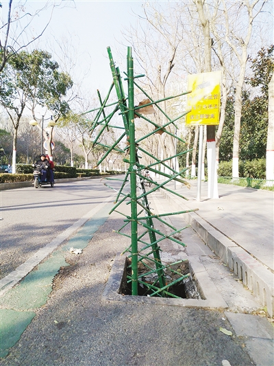昨日,网友“嘉年”在朋友圈发消息说,在市区嵩山路与辽河路交叉口附近,路边一窨井盖被轧坏后,有人把绿化带旁损坏的竹篱笆竖着放在窨井中,提醒路人注意安全。本报记者 齐 放 摄