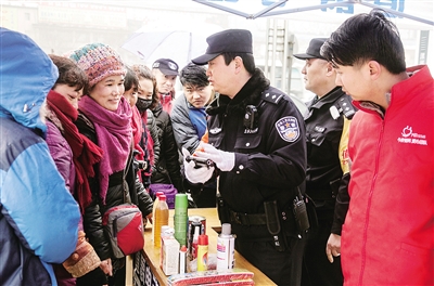 ←2017年春运在即,1月5日上午,在漯河火车站广场,铁路民警向市民介绍不能携带上车的各种管制物品。