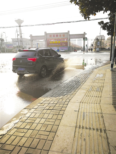 下午4时20分,不少路面上的积雪都已经融化。记者来到市区太行山路与纬一路交叉口东北角,因为化雪路面积了一摊水,不少电动车和公交车经过此处都减速慢行。记者和三位市民正在水坑旁边的人行道上行走,后方一辆私家车快速从路面上行驶而来。在经过交叉口的水坑时,车主仿佛没有顾忌到路边还有行人,直接碾压过水坑后扬长而去。车辆经过水坑时,车轮带起一大片水花喷溅到人行道上,一位女士只能后退几步连忙躲避。“路上这么一大滩水难道车主就没有看见吗?幸好人家避让及时,不然肯定要被溅一身水。”市民赵大爷生气的告诉记者,现在都提倡文明出行,一些车主在开车时也要注意自身素质,不要只顾着自己,给他人带来不便。