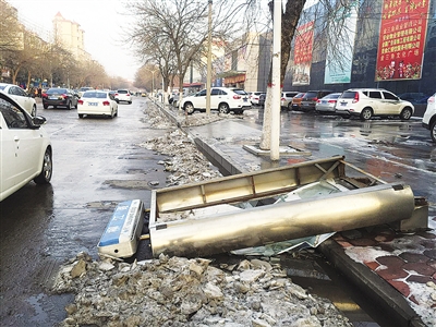 2月22日,市区柳江路与嵩山路交叉口东20米处,一个路名牌倒在辅道上,不美观还影响通行。