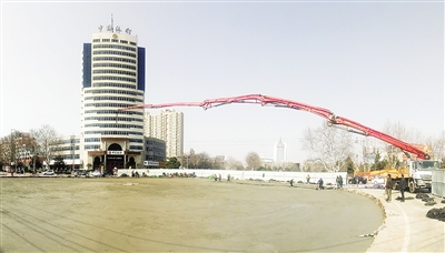 2月26日,市区嵩山路与黄河路交叉口的大转盘已拆除,现场工作人员正在浇灌底层水泥。据悉,4月10日前,市政管理处将完成转盘改造施工。届时,十字路口将设置渠化分流岛,并引入智能化交通设施。