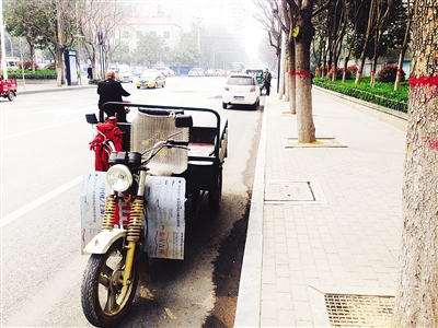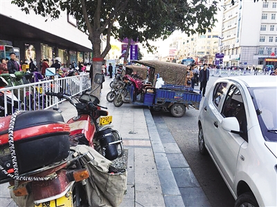 在交通路某商场门口,有不少汽车、机动三轮车和摩托车乱停乱放,侵占了人行道和非机动车道,造成一些行人只能走上机动车道上,存在着安全隐患。