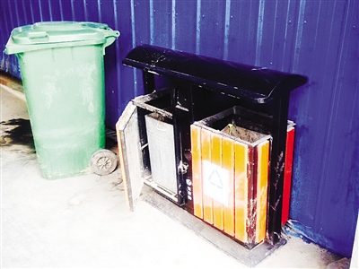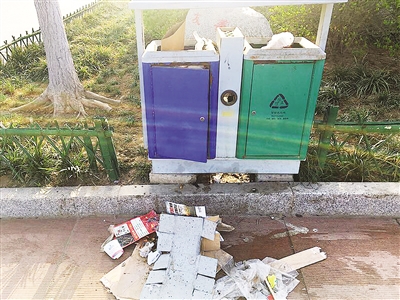 在市科教文化艺术中心东入口处,一些垃圾箱塞得满满的,地上也散落着垃圾。记者看到垃圾箱上清楚地标注着垃圾分类的字样,但是市民们并没有将垃圾分类放入。