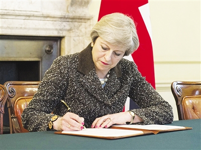 自29日宣布启动脱离欧盟的程序,英国“脱欧”迈出标志性一步。按《里斯本条约》第50条,退出欧盟的成员国应向欧洲理事会提出正式申请,就是以信函的方式。英国首相特蕾莎·梅28日晚间签署英国启动“脱欧”程序的通知信函,这份信函在29日午间由英国驻欧盟大使蒂姆·巴罗递交至欧洲理事会主席图斯克手中。随着这封信函递出去,英国“脱欧”大局已定,再也没有回头的余地了。