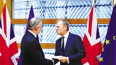 英驻欧盟大使向欧洲理事会主席图斯克(右)递交“脱欧”信。