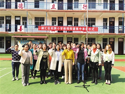 本报讯(见习记者 李文姣)4月12日下午,源汇区回族小学在学校操场上举行了源汇区回族小学教师师德集中承诺仪式暨教师师德演讲比赛。全校教师及校领导参加了师德集中承诺仪式,23名青年教师参加了师德演讲比赛。
