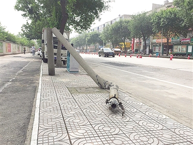随后,记者在市区人民路与解放路交叉口东约200米北侧的人行道上,找到了这根线杆:线杆已断成三节,根部约2米高的一节直立着,中间一节斜跨在路面上,还有一节倒在地上,破碎的线杆处裸露着钢筋。