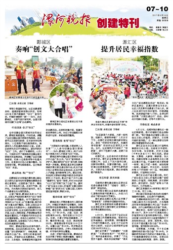 源汇区开展了“文明楼院”“文明家庭”“文明诚信商户”“优秀环卫工”等评选表彰活动。开展了“万名党员下基层、服务双创做贡献”“周末文化广场志愿服务活动”等活动;组织区直单位、区属文明单位与乡办、社区人员及青年志愿者3万余人次,深入社区进行创文知识宣传、问卷调查等,发放调查问卷7.2万份。各单位积极开展“文明交通出行”活动,按时在分包路口执勤,劝导不文明行为。