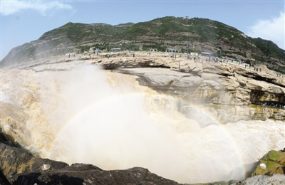 ↑↓由于近期上游调水调沙,含有大量泥沙的黄河水流经壶口时浊浪滔天,犹如黄龙翻滚,吸引众多游客前来观赏。