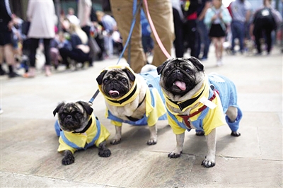 八哥节上,各式各样的八哥犬身着盛装,萌态可掬。八哥节为英国地方和国家犬类慈善事业提供支持,英国已有多个城市举办过这一活动。据中新网