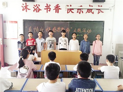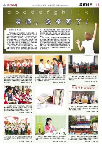 9月8日下午,在第33个教师节来临之际,泰山中路小学开展了主题为“真情祝福,感恩老师”的教师节系列活动。五(2)班同学在吴春玲老师的带领下,一首诗朗诵《我爱您,老师》把活动推向高潮。“是谁把无知的我们领进知识的大门,是谁在我们犯错误的时候,总是耐心地等待着我们的长大……”全班学生声情并茂地朗诵,赢得教师们阵阵掌声。
