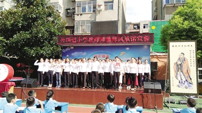 9月8日,源汇区外国语小学举办了教师表彰大会,表彰会上,老师们郑重宣誓,要用优秀的师德师风和精神面貌投入到新学年的教学工作中。