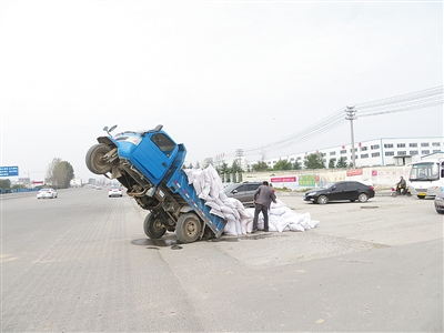 10月23日上午,一辆载货农用三轮车经过市区井冈山路与龙江路交叉口时,因车身失衡车头突然翘了起来,货物散落一地。本报记者 王海防 摄