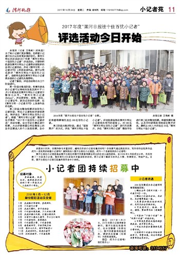 本报讯(记者 王艳彬)好消息!为了给小记者们更多激励,也希望小记者们长大以后有更多美好回忆,漯河日报社决定启动2017年度“漯河日报社十佳百优小记者”评选活动。只要你积极参加漯河日报社小记者俱乐部组织的各项小记者活动,并在《漯河日报·小记者月刊》上积极发表作品,都可以报名参评“漯河日报社十佳百优小记者”,连续报名参加漯河日报社小记者俱乐部的小记者优先推荐哟。