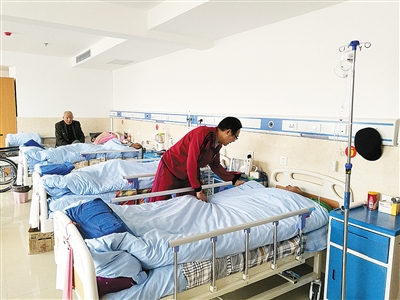记者来到位于三楼的生活区,只见在一间双人间中,一位老人躺在床上看电视,护士周永瑞正在为他输水。老人叫韩玉栋,今年85岁,患有脑梗后遗症。因为老人活动不便,护士便来到老人的房间为其进行治疗。