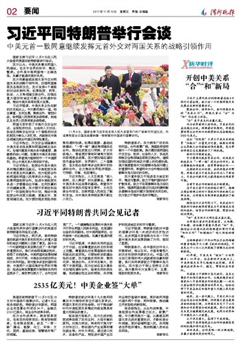习近平强调,特朗普总统对中国的国事访问是一次成功的历史性访问,此次两国元首会晤为今后一个时期中美关系的发展明确了方向、规划了蓝图。