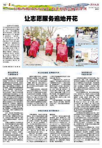 在社区志愿服务方面,我市全面深化服务内容,促和谐行动。将每年3月定为全市志愿服务集中行动月,以“践行志愿服务、传承雷锋精神”为主题,以敬老、助残、帮困、社区服务为内容,组织志愿者深入社区、深入家庭,为“五老”开展生活照料、圆老人一个心愿(陪老人过一次生日、逛一次公园、参观一次市容市貌、看一场演出、做一顿可口的饭菜、提供一次生活护理服务)等志愿服务活动;为残疾人提供生活照料、医疗保健、健康咨询等服务;为社区群众提供法律援助、家电维修、就业咨询培训、义务家教、禁毒知识宣传、文艺演出、科技文化普及等志愿服务。