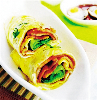 做法:1.生菜叶洗干净备用,将猪肉丝用橄榄油炒熟,胡萝卜丝过开水烫熟备用。2.和适量的面糊,用平底锅或不粘锅做薄煎饼(可软可脆),等煎饼快熟时,将鸡蛋摊平在煎饼上,然后放入猪肉丝,胡萝卜丝,生菜叶,卷起来,切成两份。